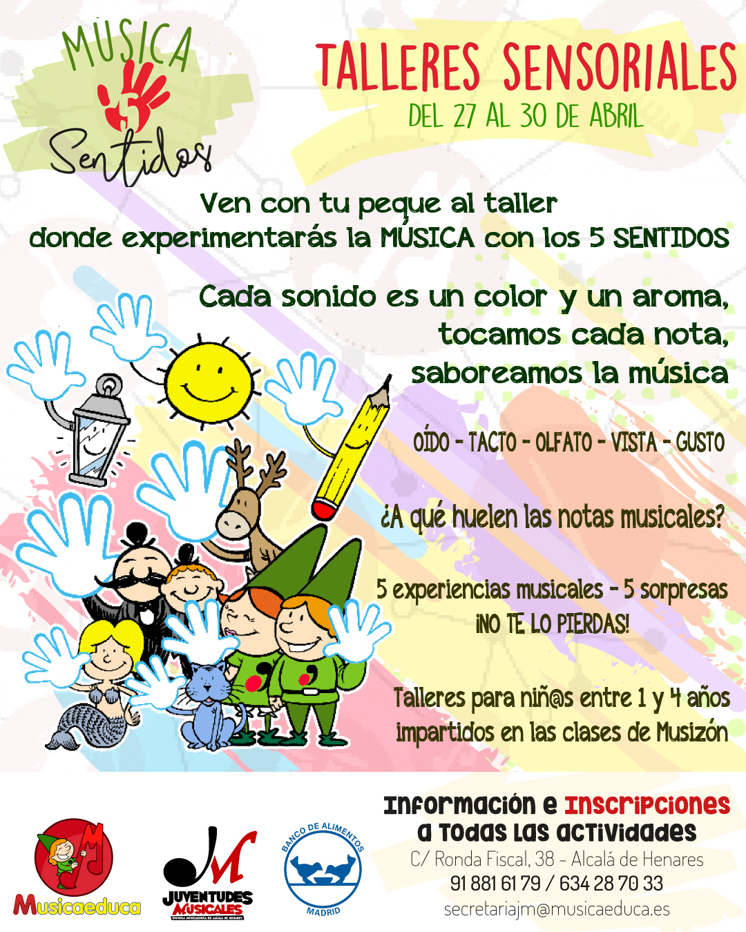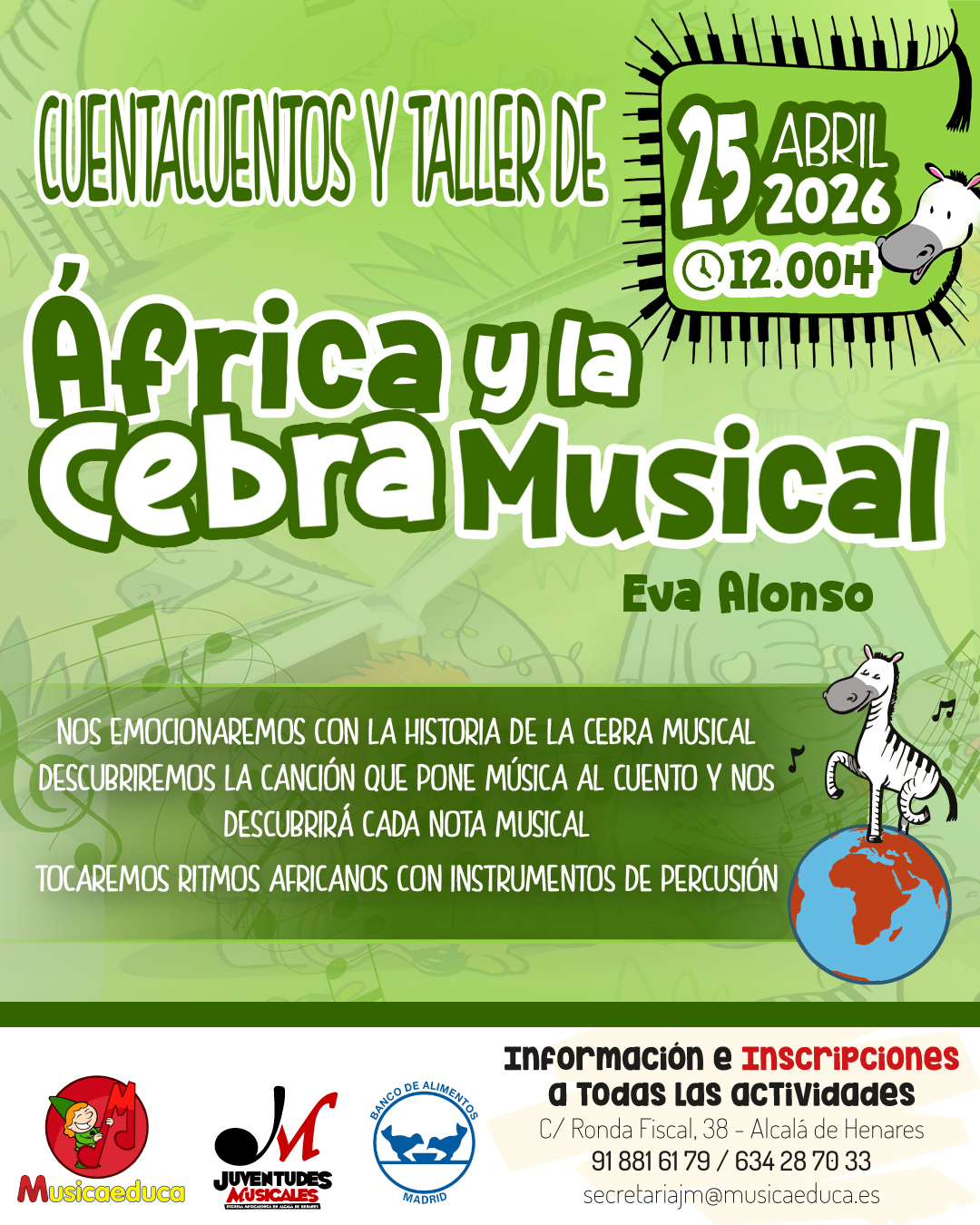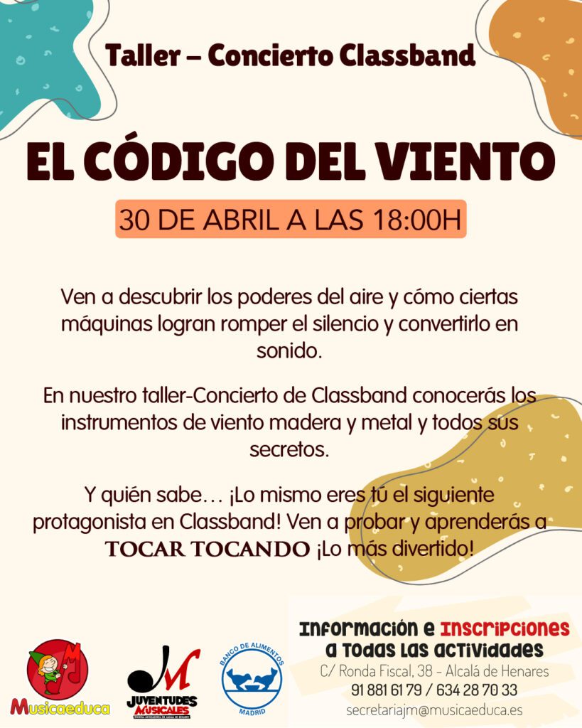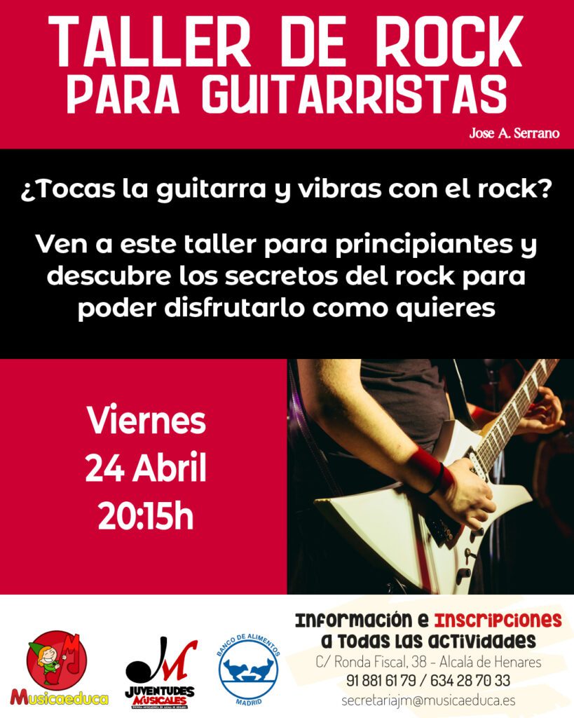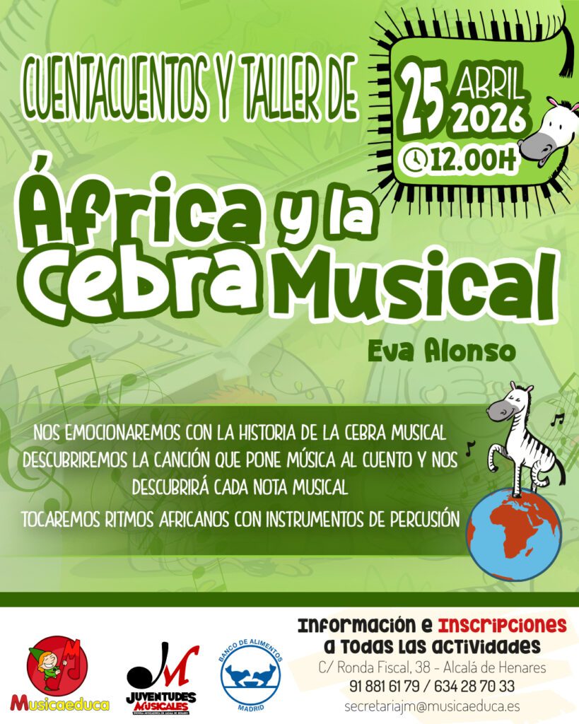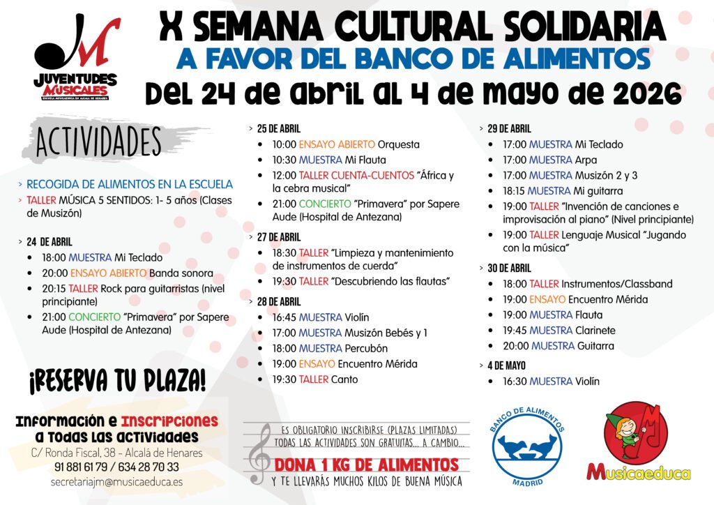 Todas las actividades son gratuitas a cambio de vuestros donativos para el Banco de alimentos y se desarrollarán en la Escuela Musicaeduca Juventudes Musicales: C/ Ronda Fiscal, 38 (28803 Alcalá de Henares)
