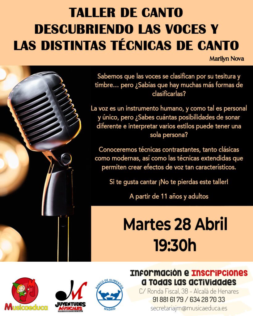 - TALLER DE CANTO “DESCUBRIENDO LAS VOCES Y LAS DISTINTAS TÉCNICAS DE CANTO” (+ 11 años y adultos). Marilyn Nova
