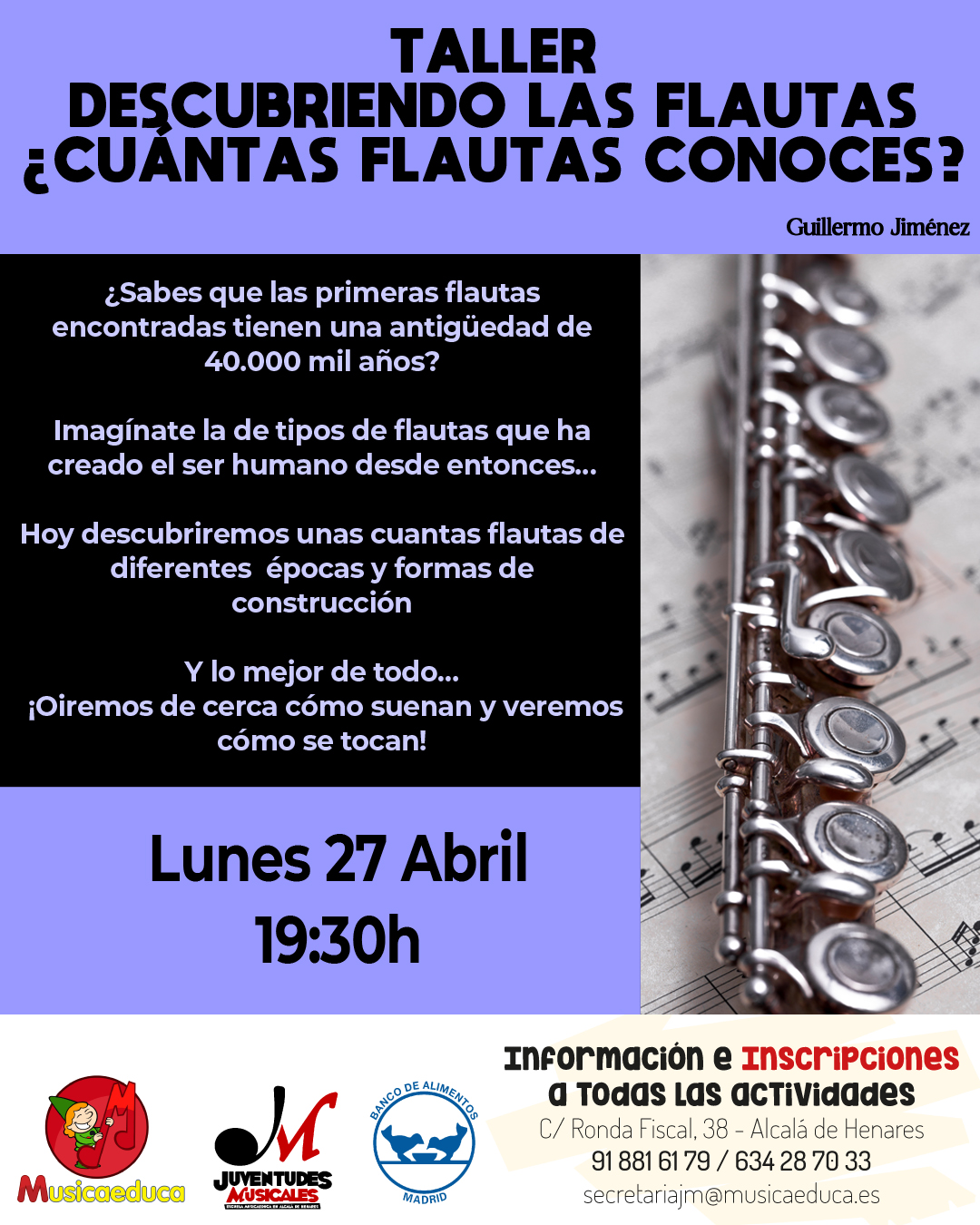 - TALLER “DESCUBRIENDO LAS FLAUTAS ¿CUÁNTAS CONOCES?” (+ 4 años y adultos). Guillermo Jiménez