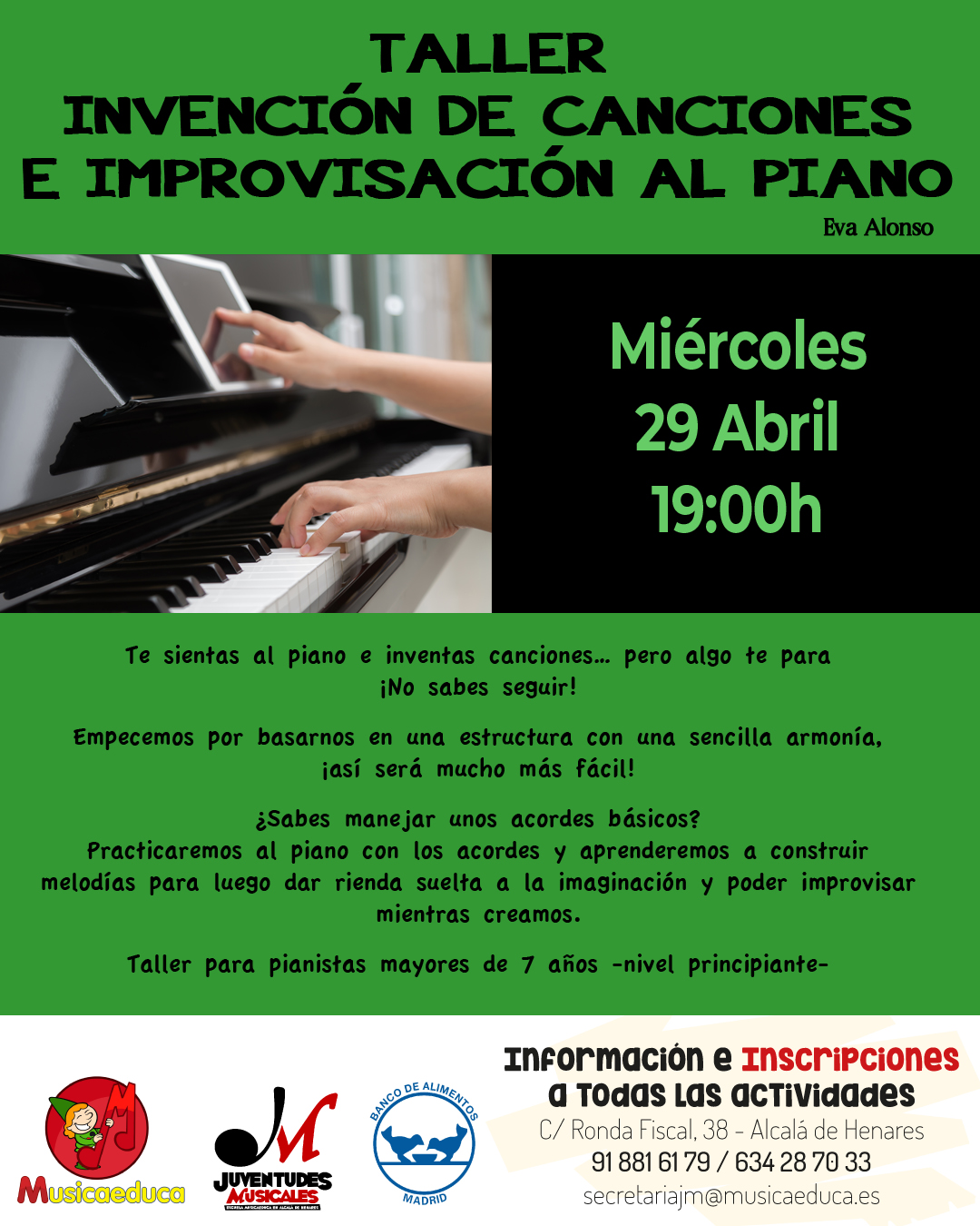 - TALLER “INVENCIÓN DE CANCIONES E IMPROVISACIÓN AL PIANO” (pianistas + 7 años, nivel principiante). Eva Alonso